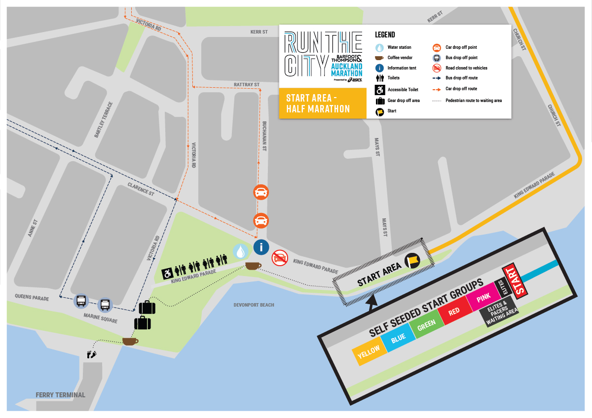 The Half Marathon course runs from Devonport on Auckland's North Shore, through Takapuna to the Smales Farm Bus Station where it joins the Busway southbound to the Auckland Harbour Bridge. After crossing the bridge, the course takes in Westhaven Marina, the Wynyard Quarter before finishing at Victoria Park. The course is best described as "rolling".